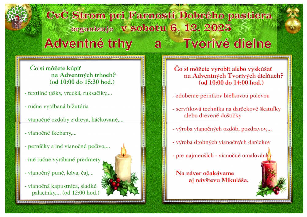 Srdečne pozývame všetky vekové kategórie na Adventné trhy v sobotu 6.12. v priestoroch CVČ Strom od 10:00-15:30 hod. Pre deti budú pripravené aj tvorivé dielne od 10:00-14:00 hod. Na záver očakávame aj návštevu Mikuláša. Počas trhov nebude chýbať občerstvenie a od 12:00 hod. aj teplá kapustnica a sladké palacinky až do vyčerpania zásob.